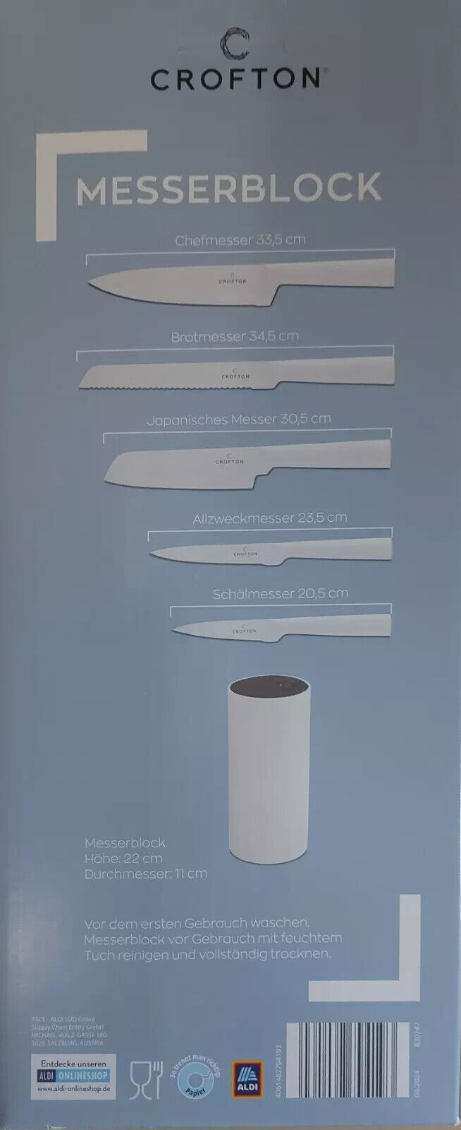 ارتفاع كتلة السكين: ٢٢ سم. القطر: ١١ سم.