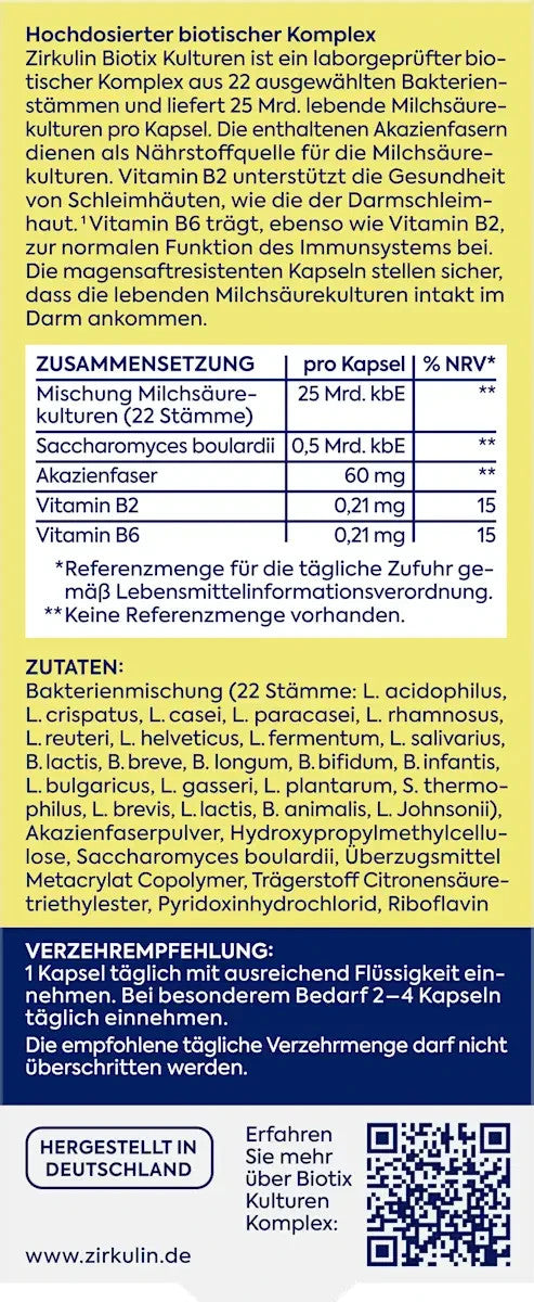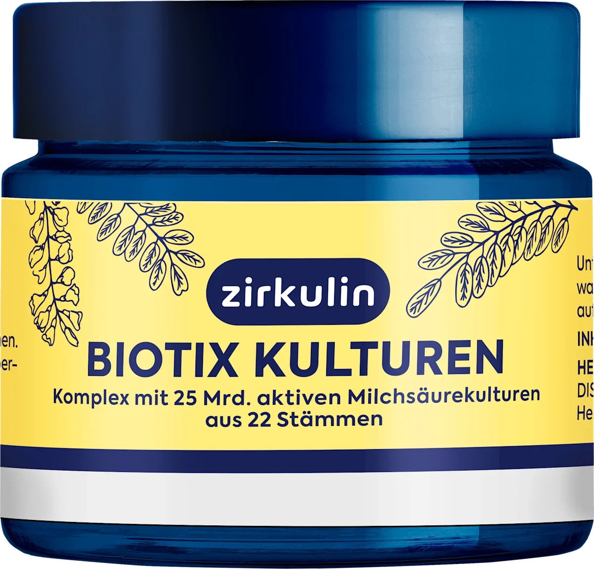 زيركولين بيوتيكس كالتشرز هو مُركّب حيوي مُختَبَر مخبريًا، يحتوي على 22 سلالة بكتيرية مُختارة، يُوفّر 25 مليار بكتيريا حمض اللاكتيك الحية في كل كبسولة. تُعدّ ألياف الأكاسيا التي يحتويها مُغذّيًا لبكتيريا حمض اللاكتيك. يُعزّز فيتامين ب2 صحة الأغشية المخاطية، مثل بطانة الأمعاء، ويُساهم فيتامين ب6 الذي يحتويه في الوظيفة الطبيعية للجهاز المناعي. كبسولات مُركّب بيوتيكس كالتشرز مُغلّفة معويًا لضمان وصول المُركّب الحيوي إلى الأمعاء سليمًا.