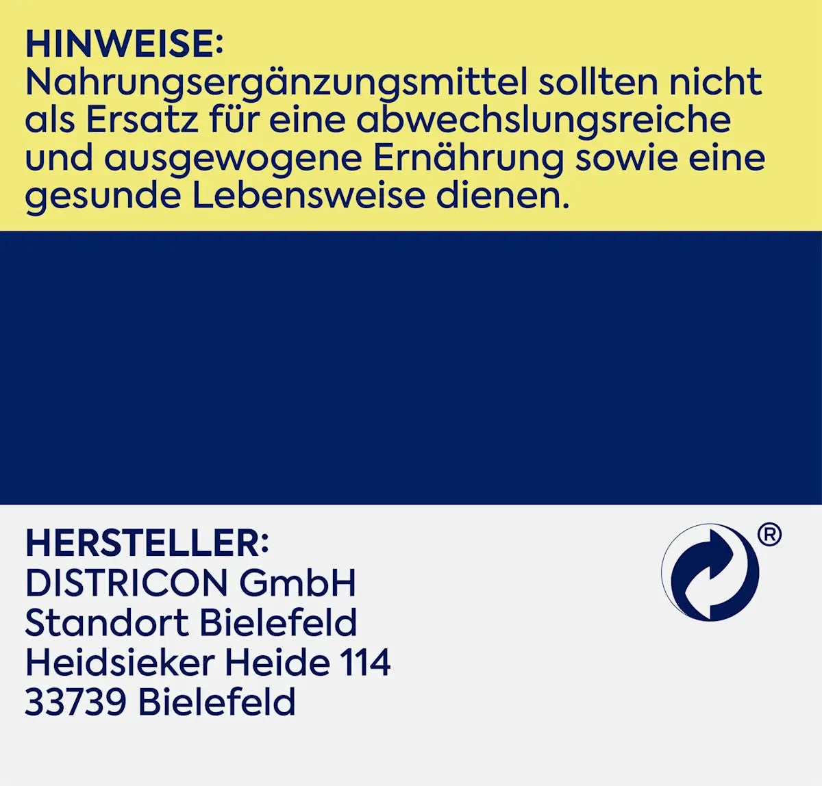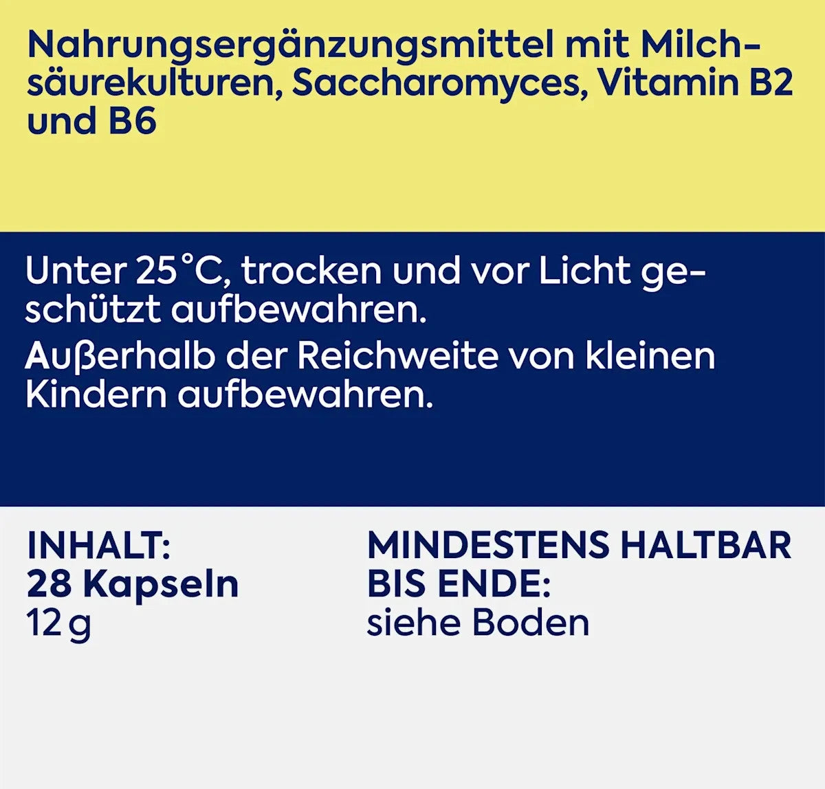 طريقة الاستخدام: الجرعة الموصى بها: تناول كبسولة واحدة يوميًا مع كمية كافية من السوائل. في حالات الضرورة القصوى، تناول من 2 إلى 4 كبسولات يوميًا. لا تتجاوز الجرعة اليومية الموصى بها. المكونات الاسم الدقيق للمنتج: مكمل غذائي مع مزارع حمض اللاكتيك، خميرة الخميرة، فيتامين ب2 وب6 المكونات: خليط بكتيري (22 سلالة: L. acidophilus، L. crispatus، L. casei، L. paracasei، L. rhamnosus، L. reuteri، L. helveticus، L. fermentum، L. salivarius، B. lactis، B. breve، B. longum، B. bifidum، B. infantis، L. bulgaricus، L. gasseri، L. plantarum، S. thermophilus، L. brevis، L. lactis، B. animalis، L. Johnsonii)، مسحوق ألياف الأكاسيا، هيدروكسي بروبيل ميثيل سلولوز، خميرة الخميرة بولاردي، عامل طلاء كوبوليمر ميثاكريلات، سترات ثلاثي إيثيل الناقل، هيدروكلوريد البيريدوكسين، ريبوفلافين المعلومات الغذائية التركيبة لكل جرعة يومية* القيمة الغذائية المرجعية (NRV) %** فيتامين ب2، ريبوفلافين 0.21 ملغ 15% فيتامين ب6 0.21 ملغ 15% **القيم الغذائية المرجعية (NRV) للجرعة اليومية وفقًا للائحة معلومات الأغذية. لا يُنصح باستخدام المكملات الغذائية كبديل لنظام غذائي متنوع ومتوازن ونمط حياة صحي. يُحفظ في درجة حرارة أقل من 25 درجة مئوية، في مكان جاف بعيدًا عن الضوء. يُحفظ بعيدًا عن متناول الأطفال الصغار. عنوان الشركة: Districon GmbH، Bessie-Coleman-Straße 13، DE-60549 فرانكفورت، kontakt@districon.de. تعليمات التخزين: يُحفظ في درجة حرارة أقل من 25 درجة مئوية، في مكان جاف بعيدًا عن الضوء. يُحفظ بعيدًا عن متناول الأطفال الصغار.