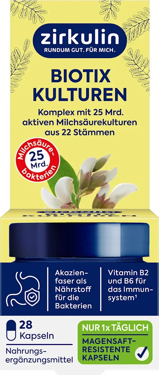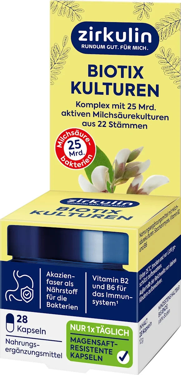 تُقدّم كبسولات بيوتيكس من زيركولين مُركّبًا حيويًا يحتوي على 25 مليار مُستنبت بكتيريا حمض اللاكتيك النشطة من 22 سلالة بكتيرية مُختارة. تُشكّل ألياف الأكاسيا التي تحتويها الكبسولات مصدرًا غذائيًا لبكتيريا حمض اللاكتيك، ويُساهم فيتامين ب6 في الوظيفة الطبيعية للجهاز المناعي. علاوةً على ذلك، يضمن الغلاف المعوي وصول بكتيريا حمض اللاكتيك الحية إلى الأمعاء سليمةً. هذا ما يجعل هذه الكبسولات سهلة الاستخدام مثالية للاستخدام اليومي.