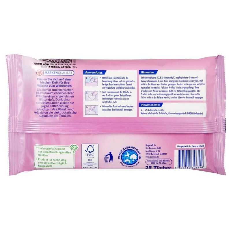 Die domol Trocknertücher Blütentraum verleihen Ihrer Wäsche einen angenehmen Blütenduft. Dank einer speziellen Lotion wirken sie gegen Faltenbildung, erleichtern das Bügeln und reduzieren die elektrostatische Aufladung der Textilien.