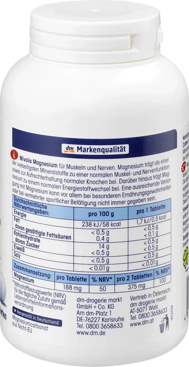 Produkta īpašības: vegāns, bez laktozes, bez glutēna, veģetārs. Lietošanas norādījumi: 1 tablete dienā. Palielinātai magnija nepieciešamībai lietot 2 tabletes visas dienas garumā, uzdzerot daudz šķidruma. Nepārsniegt ieteicamo dienas devu. Uztura bagātinātājus nedrīkst lietot kā daudzveidīga un sabalansēta uztura un veselīga dzīvesveida aizvietotāju. Šis produkts nav piemērots bērniem un pusaudžiem. Var būt caureju veicinoša iedarbība. Ja Jums ir nieru darbības traucējumi, pirms lietošanas konsultējieties ar ārstu. Izvairieties no citiem magnija avotiem vai pārtikas produktiem, kas bagātināti ar magniju. Pārmērīga sorbīta lietošana var izraisīt caureju veicinošu iedarbību. Sastāvdaļas: Precīzs produkta nosaukums: Uztura bagātinātājs ar magniju. Sastāvdaļas: magnija karbonāts, magnija oksīds, pildviela sorbitols, pildviela mikrokristāliskā celuloze, pretsalipes viela silīcija dioksīds un taukskābju magnija sāļi. Piedevas Satur pildvielu Satur pretsalipes vielu Uzturvērtības informācija Vidējās uzturvērtības uz 100 g Enerģētiskā vērtība 238 kJ / 58 kcal Tauki < 0,5 g, tostarp piesātinātās taukskābes 0,4 g Ogļhidrāti 14 g, tostarp cukuri < 0,5 g Olbaltumvielas < 0,5 g Sāls < 0,01 g Sastāvs Uz vienu dienas devu* % NRV** Magnijs 188 mg 50% *atbilst 1 gab. **Uzturvielu atsauces vērtības (NRV) dienas devai saskaņā ar Pārtikas informācijas regulu Uzglabāšanas instrukcijas Sargāt no maziem bērniem. Uzglabāt temperatūrā zem 25 °C, sausā vietā, sargāt no gaismas. Informācija par produkta atbilstību (ražotājs/ES atbildīgā persona): dm-drogerie markt GmbH + Co. KG Am dm-Platz 1 76227 Karlsruhe service@dm.de Izcelsmes valsts: Vācija, magnija karbonāts no valstīm, kas nav ES Lūdzu, skatiet informāciju uz iepakojuma.