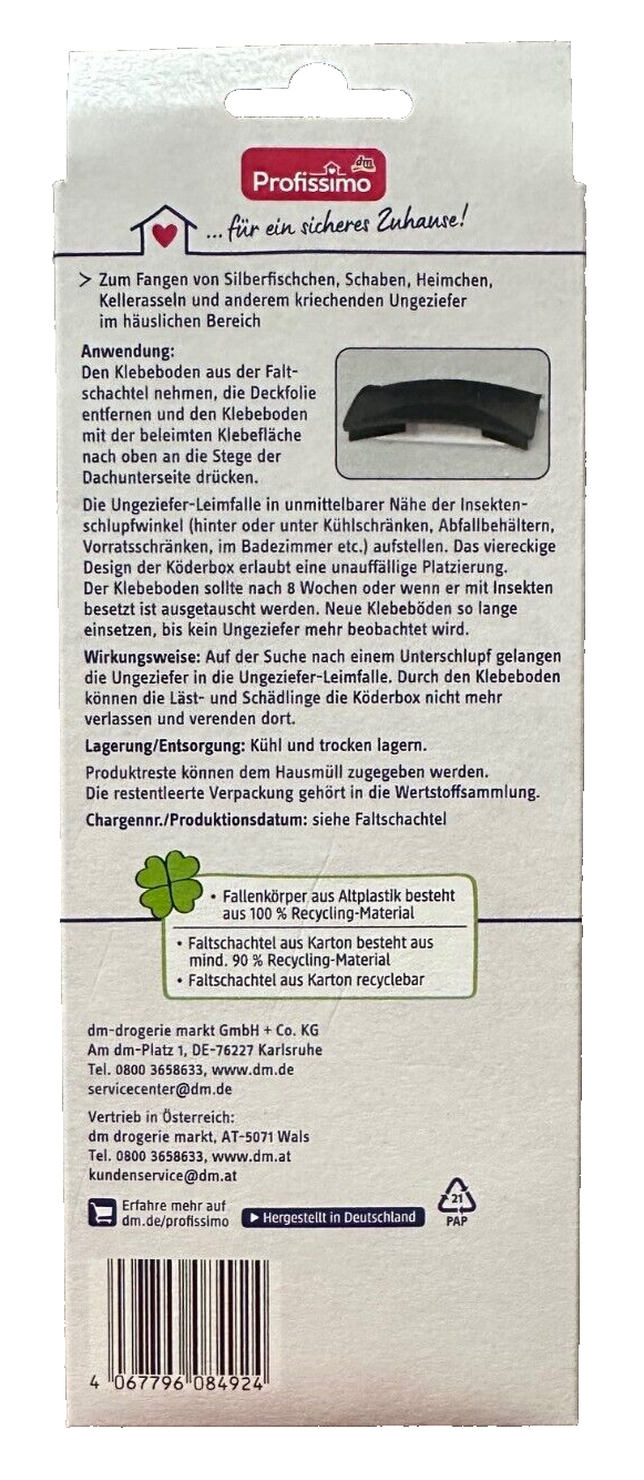 Profissimo kukaiņu līmes slazds piedāvā efektīvu kaitēkļu apkarošanas risinājumu. Šo lietošanai gatavo, insekticīdu nesaturošo slazdu var izmantot visu gadu. Pateicoties tā inovatīvajam dizainam un tehnoloģijai, tas ir kompakts un viegli novietojams zem mēbelēm vai ledusskapjiem. Efektīvai kaitēkļu apkarošanai pietiek ar vienu līdz diviem slazdiem katrā telpā atkarībā no invāzijas. Ideāli piemērots ikvienam, kurš meklē drošu un vienkāršu kaitēkļu apkarošanas metodi.