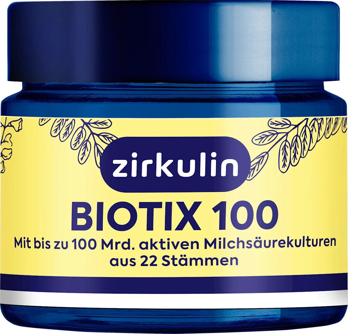 Zirkulin BIOTIX 100 kapsulas ir augstas devas biotisks komplekss, kas izgatavots no 22 rūpīgi atlasītiem baktēriju celmiem, kas katru dienu nodrošina organismu ar miljardiem dzīvu pienskābes baktēriju. Ērtās, zarnās šķīstošās kapsulas nodrošina, ka dzīvās pienskābes baktērijas nonāk zarnās neskartas. Tas padara tās ideāli piemērotas ikdienas lietošanai. Komplekss satur arī B6 vitamīnu, kas var veicināt normālu imūnsistēmas darbību.