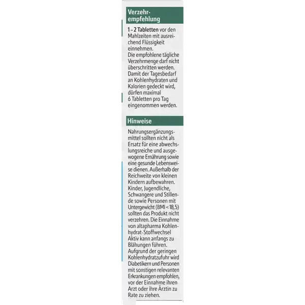 Nahrungsergänzungsmittel sollten nicht als Ersatz für eine abwechslungsreiche und ausgewogene Ernährung sowie eine gesunde Lebensweise dienen. Die empfohlene tägliche Verzehrmenge darf nicht überschritten werden. Kinder, Jugendliche, Schwangere und Stillende sowie Personen mit Untergewicht (BMI < 18,5) sollten das Produkt nicht verzehren. Die Einnahme von altapharma Kohlenhydrat- Stoffwechsel Aktiv kann anfangs zu Blähungen führen. Aufgrund der geringen Kohlenhydratzufuhr wird Diabetikern und Personen mit sonstigen relevanten Erkrankungen empfohlen, vor der Einnahme ihren Arzt zu Rate ziehen.