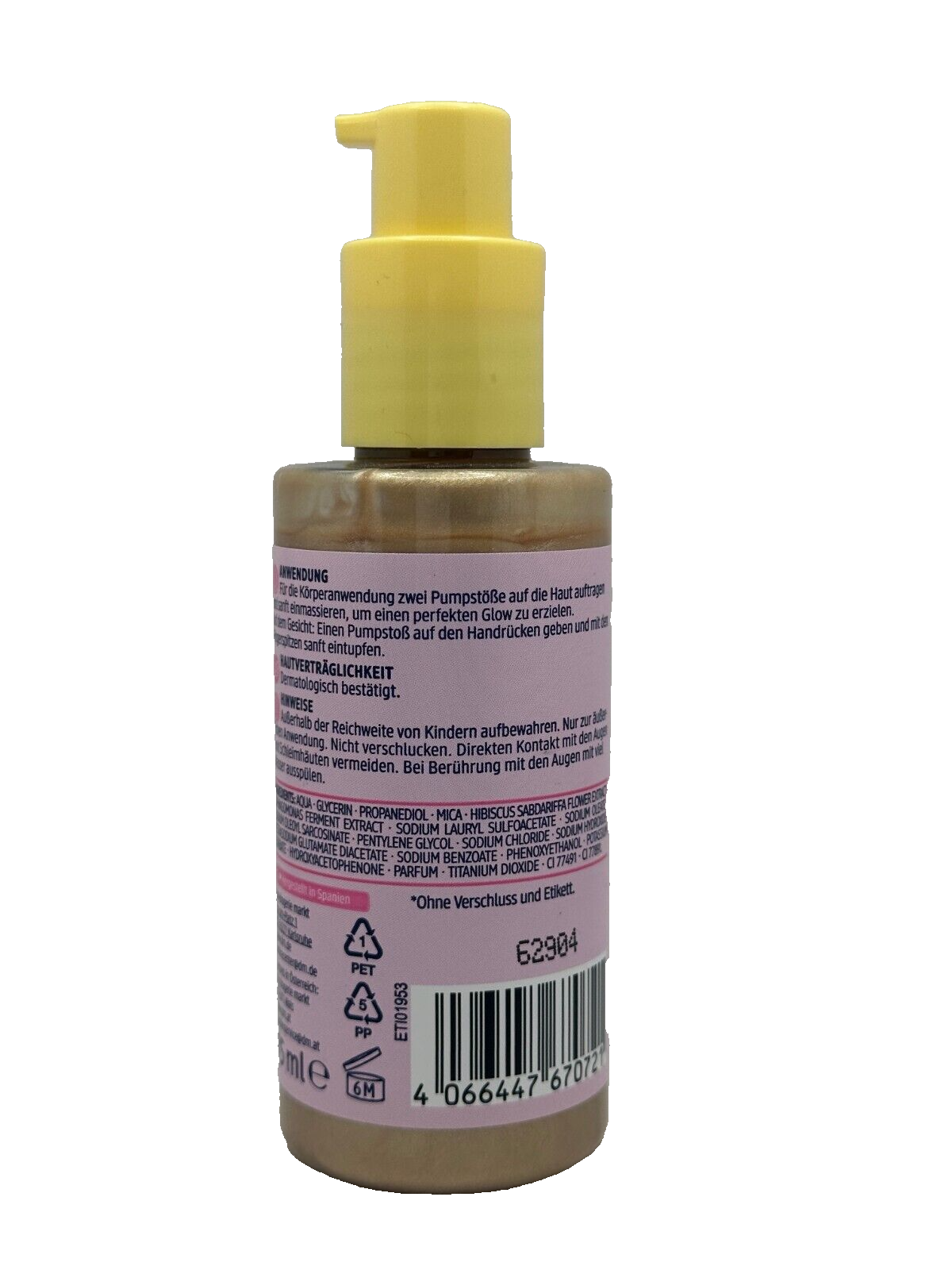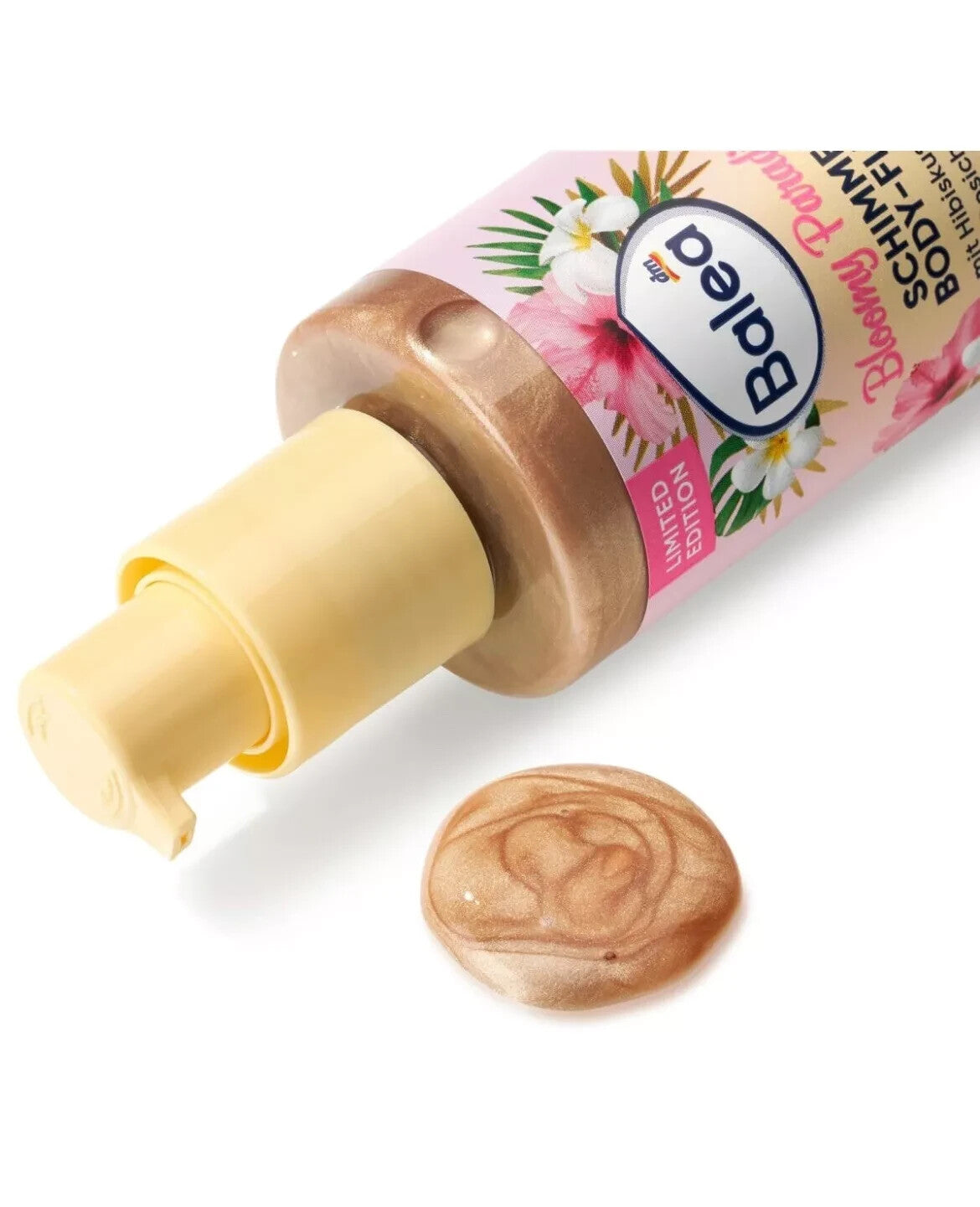 Das Schimmer Fluid Bloomy Paradise von Balea sorgt nicht nur für einen sommerlich-exotischen Duft, sondern hinterlässt einen zarten goldenen Schimmer auf der Haut. Zusätzlich wird die Haut erfrischt und gepflegt. Rezeptur ist ohne Mikroplastik und wasserlösliche rein synthetische Polymere