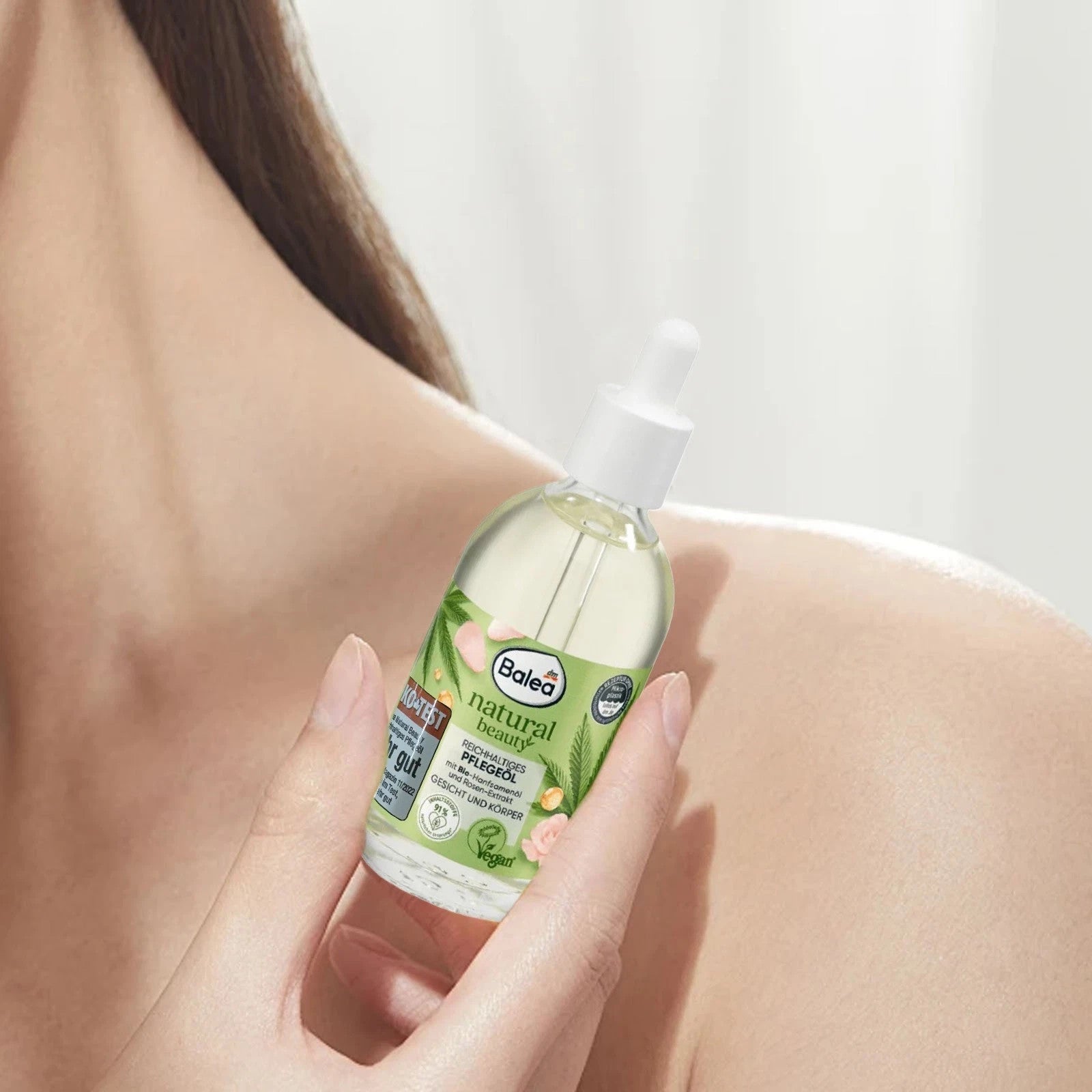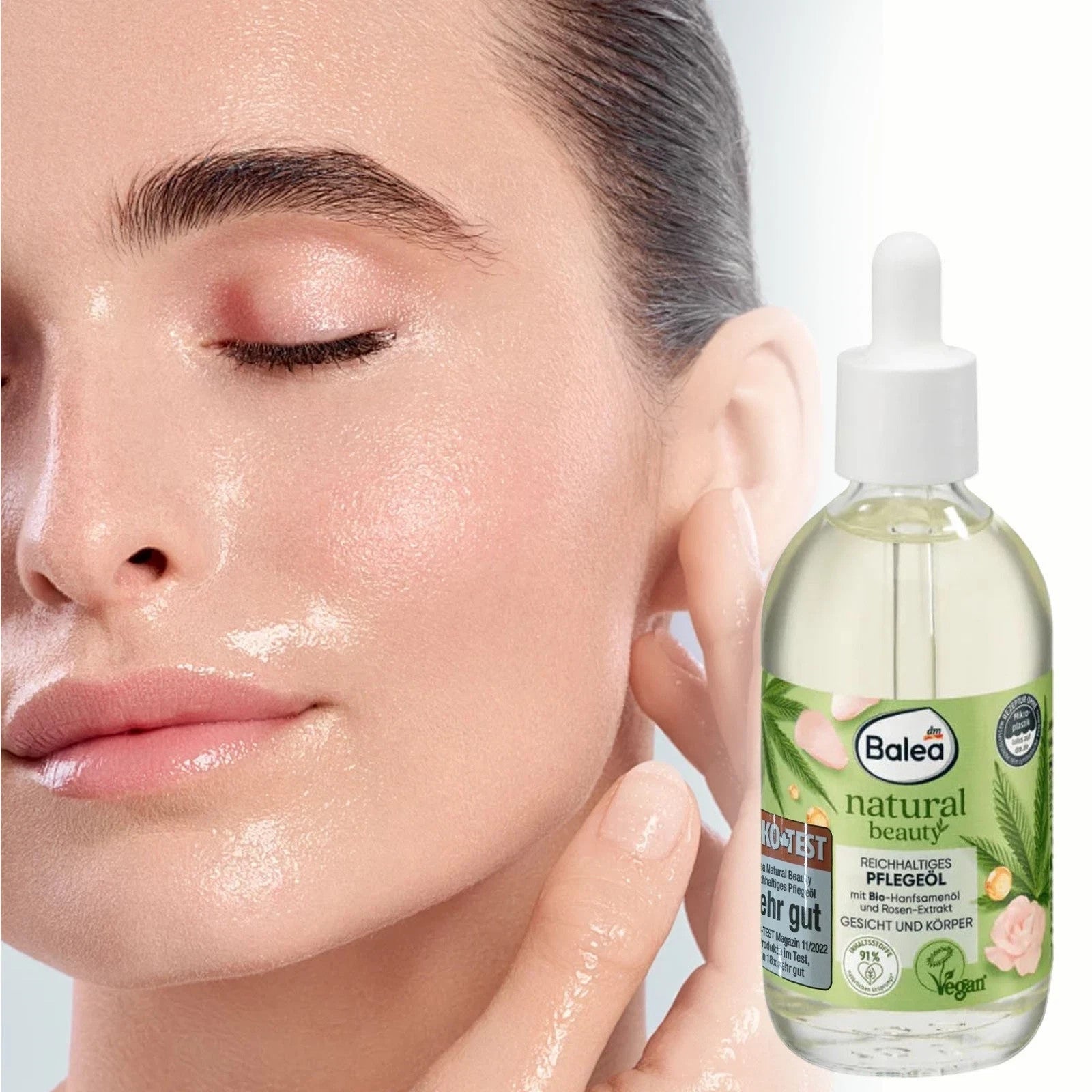 Das Balea Natural Beauty Pflegeöl Bio pflegt Gesicht und Körper. Wertvolles Bio-Hanfsamenöl und Rosen-Extrakt verwöhnen die Haut und pflegen sie geschmeidig-zart. Die Hautverträglichkeit ist dermatologisch bestätigt. Rezeptur ohne Mikroplastik und wasserlösliche rein synthetische Polymere.