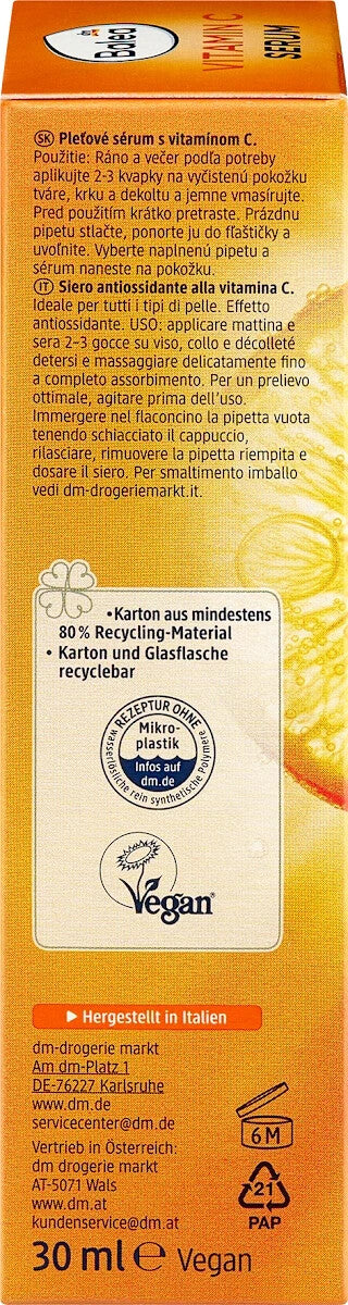Produktmerkmale Hauttyp: Alle Hauttypen Produkteigenschaften: Besonders für das Gesicht geeignet, Ohne Paraffine / Mineralöle, Ohne Parabene, Ohne Aluminiumsalze, Ohne Nanopartikel, Ohne Farbstoffe, Vegan Anwendungsbereich: Gesicht Textur / Konsistenz / Applikation: Serum Inhaltsstoffe Ingredients: AQUA, DICAPRYLYL ETHER, PENTYLENE GLYCOL, POLYGLYCERYL-6 STEARATE, GLYCERIN, PRUNUS ARMENIACA KERNEL OIL, ASCORBYL TETRAISOPALMITATE, PHENOXYETHANOL, PARFUM, SCLEROTIUM GUM, STEARYL ALCOHOL, ASCORBYL PALMITATE, XANTHAN GUM, LIMONENE, POLYGLYCERYL-6 BEHENATE, POTASSIUM CETYL PHOSPHATE, 1,2-HEXANEDIOL, CAPRYLYL GLYCOL, MALPIGHIA GLABRA FRUIT JUICE, MALTODEXTRIN, SODIUM HYDROXIDE, LINALOOL, TOCOPHEROL, GERANIOL. Verwendungshinweise Dermatologisch bestätigt. Morgens und abends nach Bedarf 2-3 Tropfen auf die gereinigte Haut von Gesicht, Hals und Dekolleté auftragen und sanft einmassieren. Für eine optimale Entnahme vor der Anwendung kurz schütteln. Entleerte Pipette mit gedrücktem Saughütchen in die Flasche eintauchen, loslassen, befüllte Pipette entnehmen und das Serum dosieren. Das Serum eignet sich ideal als Grundlage für die Aufnahme von weitere Pflegeprodukte oder auch als Make-up-Unterlage. Informationen zur Produktkonformität (Hersteller/EU-verantwortliche Person): dm-drogerie markt GmbH + Co. KG Am dm-Platz 1 76227 Karlsruhe service@dm.de Ursprungsland/Herkunftsort: Italien Bitte Beachten Sie die Angaben auf der Packung.