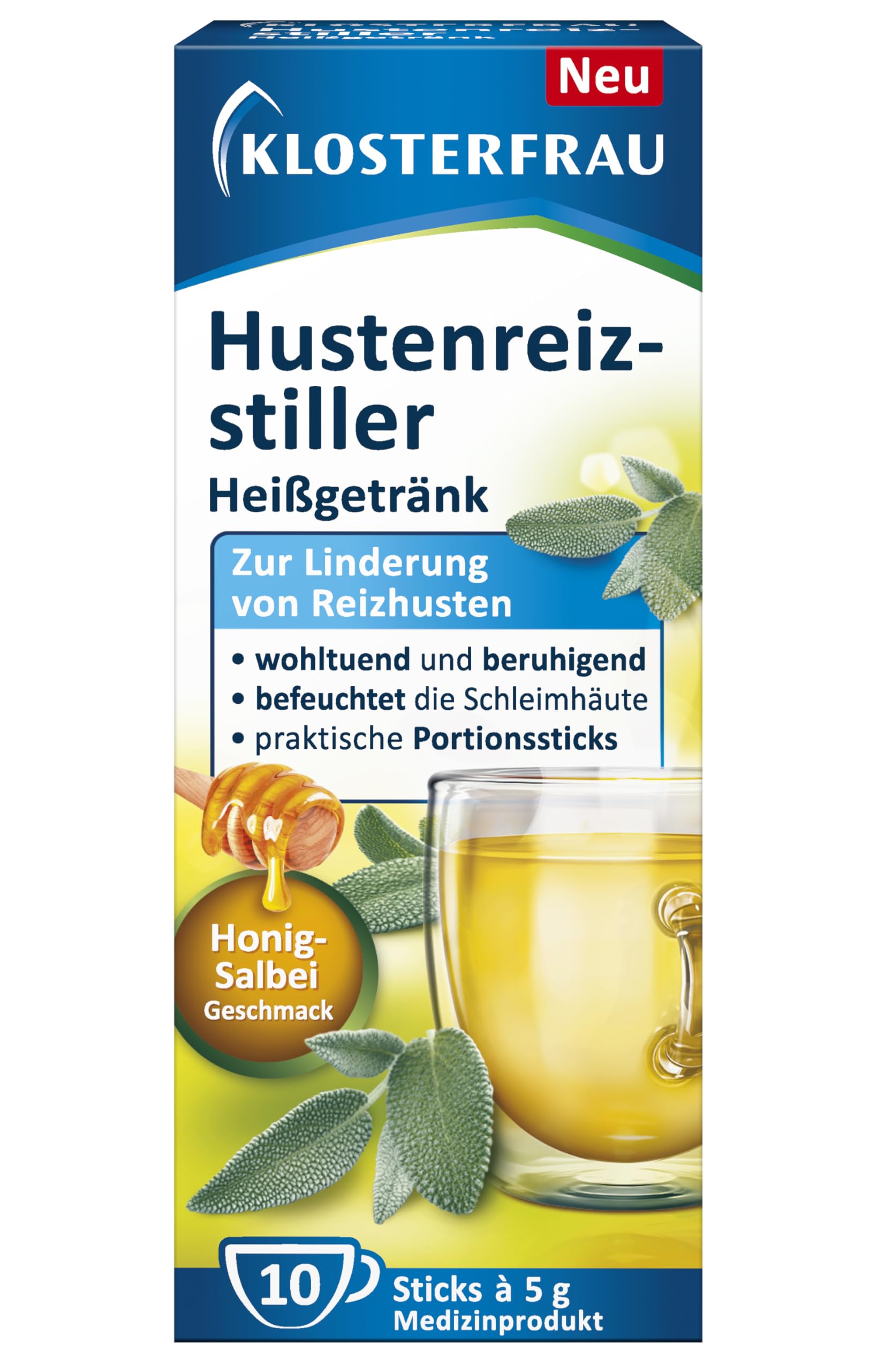 Klosterfrau Hustenreizstiller Heißgetränk | Honig-Salbei Geschmack | Zur Linderung von Reizhusten | praktische Portionssticks | 10 Stück