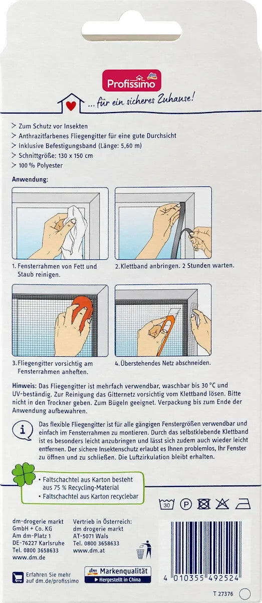 Verwendungshinweise 1. Fensterrahmen von Fett und Staub reinigen. 2. Klettband am Fensterrahmen ankleben. 3. Fliegengitter auf das angeklebte Klettband anheften. 4. Überstehendes Netz abschneiden. Zur Reinigung das Fliegengitter vorsichtig vom Klettband lösen. Waschbar bei 30°C. Hersteller und verantwortliche Person in EU: dm-drogerie markt GmbH + Co. KG Am dm-Platz 1 76227 Karlsruhe Germany service@dm.de Ursprungsland/Herkunftsort: China Bitte Beachten Sie die Angaben auf der Packung